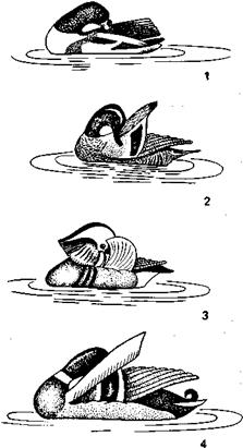 Рис. 67. Смещенная чистка перьев ухаживающими утиными: 1 — пеганка; 2 — чирок-трескунок; 3 — мандаринка; 4— кряква. Ритуализация адаптивна с двух точек зрения. Ритуализованные релизеры всегда хорошо заметны и просты. Это — адаптация к ограниченной реактивности врожденного поведения. Каждая врожденная реакция требует для своего запуска специфических стимулов; их изучение показало, что они всегда относительно просты и броски. Ритуализация обычно ведет к специализации релизера на предъявлении таких «знаковых стимулов», т. е. релизеры в определенном смысле их «материализуют». Во-вторых, ритуализация направлена на то, чтобы каждый данный релизер отличался от любого другого как у этого, так и у другого таксона. В результате облегчается социальное сотрудничество сородичей и снижается вероятность реакции на другой вид. [123] В случае интенционных движений и смещенной активности ритуализация, по-видимому, развивается одинаково. В обоих случаях главный упор может делаться как на движение, так и на структуру. Одно из самых обычных изменений движения — его «схематизация», подразумевающая подчеркивание одних компонентов и ослабление других. Это можно наблюдать, например, на некоторых ухаживающих действиях у уток. Так, «укорачивание» тела первоначально означало подъем головы и хвоста. У чирка-трескунка движение головы назад усилилось, а хвоста вверх — полностью исчезло. У чилийского чирка главный акцент сделан на движение груди, а хвост опять же не поднимается. У шилохвости задействованы и голова, и хвост; движение последнего подчеркивается ярко окрашенным треугольником у его основания и вытянутой формой. Физиологически эти и другие аспекты ритуализации можно истолковать как количественные изменения с пороговыми значениями для различных составных частей движения. Более глубокое обсуждение этих проблем увело бы нас за рамки выбранной тематики. Однако мне хотелось бы отметить, что изучение эволюции релизеров очень важно для понимания происхождения и развития «новых» элементов поведения в целом, поскольку ритуализация интенционных движений или смещенных действий ведет как раз к этому. Углубляться в данную проблему мы также не будем. Заключение. Изучение происхождения и эволюции релизеров, в частности используемых при ухаживании и угрозе, не оставляет сомнений в том, что первоначально они были случайными «побочными продуктами», разрядкой нервного возбуждения в форме интенционных движений или смещенной активности. В большинстве случаев такие формы разрядки возникают, когда нормальные ее способы подавляются одновременной активацией противоположных по направленности побуждений. Это справедливо для всех «подавленных интенционных движений», всех угрожающих смещенных действий и, возможно, для многих форм смещенной активности при ухаживании. По-видимому, такой вывод позволяет понять, почему «демонстрации» так широко распространены именно при ухаживании и угрозе. В первом случае, если половое влечение и остается главным компонентом мотивации, все же одновременно проявляются агрессивность и тенденция к избеганию. При угрозе в конфликт между собой вступают два последних побуждения. Уже говорилось, что как агрессивность, так и половое влечение необходимы для сохранения вида. Поскольку врожденное поведение складывается из 