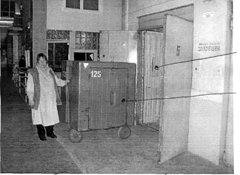1- Кабина грузового лифта; 2 - Почтовый контейнер КПМ-500. Рисунок 12.5 - Закатывание контейнера в грузовой лифт