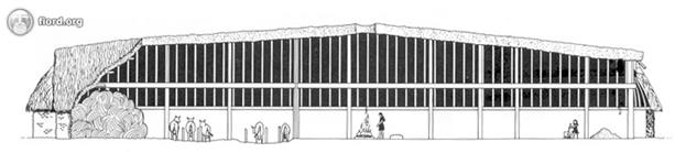 Длинный дом X века. Слева направо: склад для кормов и хлев, кухня, жилое помещение с двумя очагами на возвышении, амбар Многие учёные сходятся во мнении, что корабль скандинава – это подобие его сухопутного жилища. И действительно, викинг проводил на корабле очень значительную часть своей жизни при длительных морских переходах. Поэтому его второй дом, драккар, так похож на сухопутный вариант. Ценности древнего скандинава – это богатство (драгоценности, корабли), походы, стремление к власти (собственные наделы, дружина), слава, пиры. На пирах самые знатные места отдавались хозяевам, если только гости не были выше по социальному статусу. Если же гостем был конунг или ярл, то он садился в центре застолья, и ему подносились самый лучшие угощения, напитки. Он усаживал возле себя самого преданного человека или того, кому доверял больше всего, так как друзья должны делить не только трудные минуты (рядом в бою), но и минуты радости и беззаботности. В целом пиры были очень бурные. Поэтому, как показывают рукописи, часто враги уничтожались именно на пирах. Дом пирующего врага окружался плотным кольцом и поджигался. Хмельные празднующие не могли оказать дельного сопротивления и, как правило, погибали целые семья, дружины.
