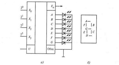 Обычно стилизованные изображения всех десятичных цифр в светодиодных индикаторах содержат семь светящихся сегментов, представленных на рис. 8.6, б. Для управления светодиодами дешифратор должен иметь семь выходов, обеспечивающих включение соответствующих сегментов светодиодов. Дешифратор работает, если на входе U присутствует сигнал высокого уровня, при сигнале низкого уровня все выходы дешифратора обнуляются, независимо от сигналов на его информационных входах.