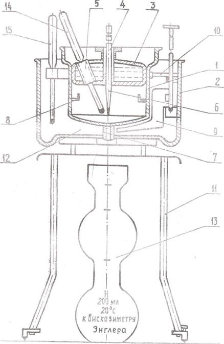 1. ЦЕЛЬ РАБОТЫ Ознакомится с устройством вискозиметра Знгдера. Определить условную вязкость предложенной жидкости (топлива). 2. ОПИСАНИЕ И ПРИНЦИП ДЕЙСТВИЯ ПРИБОРА ЭНГЛЕРА Визкозиметр Энглера, в соотзветствии с чертежом, состоит из резервуара I (для помещения испытуемой жидкости), расположенного внутри другого резервуара 2. Между этими резервуарами заливается вода, если вязкость определяется при температуре до 353 К (80° С) или масло если температура 353 К (80° С) и более. Внутренняя поверхность измерительного резервуара I отхромирована и отполирована. Дно его имеет сферическую форму. Резервуар закрывается пустотелой крышкой 3 с двумя отверстиями 4 и 5 предназначенными для деревянного штифта 6, закрывающего калиброванное отверстие 7 и для термометра 14 показывающего температуру испытуемой жидкости. К стенкам внутреннего сосуда I прикреплены три заостренных штифта 8, предназначенных для указания горизонтальности прибора. Во внешнем сосуде имеется мешалка 9, для перемешивания жидкости и термометр 15 для измерения температуры в водяной (масляной) бане. Три упора 10 фиксируют положение баков относительно друг друга. На треножнике размещаются электронагреватель 12 и резерауар 2. Объём испытываем жидкости, вытекающий через сточную трувку, измеряется мерной колбой 13. 3. ОПРЕДЕЛЕНИЕ " ВОДНОГО ЧИСЛА" ВИСКОЗИМЕТРА «Водное число» вискозиметра это время истечения 200 мл дистиллированной вода при температуре 393 К (+ 20° С). Оно обозначается 4. ОПРЕДЕЛЕНИЕ ВЯЗКОСТИ В промытый бензином и просушенный внутренний сосуд наливает испытуемую жидкость настолько что бы острия штифтов слегка выступали над уровнем. Электронагревателем нагрезают воду в бане и испытуемую жидкость. При этом воду в бане перемешивают мешалкой, а испытуемую жидкость поворачиванием крышки с термометром. В процессе нагревания следят за показаниями термометров, прогрев должен быть медленным, что бы разность температур воды в бане и испытуемой жидкости не превышала 2 К (2° С). Регулируют скорость прогрева периодическим выключением - выключением электронагревателя. При достижении заданной температуры для испытания прогрев прекращается и испытуемая жидкость выдерживается 5 минут при постоянной температуре. После этого вынимается из отверстия деревянный штифт и засекается время начала истечения по секундамеру. Когда в подставленную мерную колбу стечёт 200 мл жидкости (пена в расчёт не принимается) делает отсчёт времени конца истечения. Время.истечения жидкости обозначают где t - цифра указывающая температуру 0С, при которой определялась вязкость. Величина условной вязкости (ВУ) определяется отношением