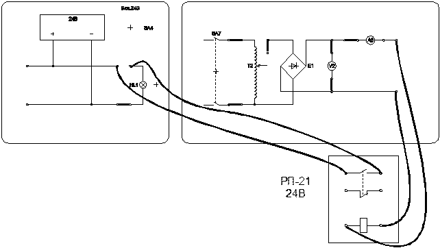 2.3.5. Для исследования свойств промежуточных реле постоянного тока с номинальным напряжением катушки 24В необходимо собрать схему согласно рис. 2.4.