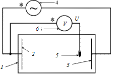 Измерительная установка (см. рисунок) включает в себя электролитическую ванну 1, заполненную водой, два электрода 2 и 3, выполненных в виде пластин или тел другой геометрической формы, подсоединенных к источнику переменного напряжения 4, зонд 5, предназначенный для исследования электрического поля, вольтметр 6, регистрирующий напряжение между электродом 2 и зондом 5, а также проводящее тело (например, металлическое кольцо), предназначенное для погружения в электролит (воду) с целью создания в нем неоднородного электрического поля (на рисунке не показано).