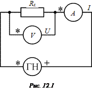 Измерения U и I проводятся с помощью вольтметра и амперметра по схеме рис. 12.1. Для достоверного определения Rх необходимо, чтобы сопротивление вольтметра RV > > Rх. Измерения Rх проводятся при различных значениях напряжения U генератора напряжения, что позволяет определить Rх для нескольких измерений и рассчитать величину погрешности.