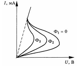 Рис.8.18. Вольт амперная характеристика фототиристора Фототиристор остается во включенном состоянии после окончания импульса светового потока. Для выключения фототиристора необходимо уменьшить напряжение или ток до значений, меньших напряжения или тока удержания. Сопротивление фототиристора во включенном состоянии единицы и доли Ом, а в выключенном – сотни кОм. Время переключения лежит в пределах 10-5…10-6 с. Если у фототиристора имеется вывод от одной из базовых областей, то подавая на управляющий электрод напряжение, смещающее соответствующий эмиттерный переход в прямом направлении, можно понижать напряжение включения. Само включение фототиристора по-прежнему будет осуществляться действием светового потока. Достоинствами фототиристоров является: малое потребление мощности во включенном состоянии, малое время включения, отсутствие искрения, малые габариты. Основными параметрами фототиристоров являются: напряжение включения Uвкл; ток включения Iвкл, соответствующий напряжению включения; напряжение выключения Uвыкл и ток выключения Iвыкл, при которых фототиристор переходит из открытого состояния в закрытое; темновой ток IТ; пусковой поток Фпуск; минимальный управляющий (пороговый) световой поток; интегральная чувствительность; время выключения tвыкл; номинальный ток открытого фототиристора Iном; максимально допустимое обратное анодное напряжение Uобр макс.