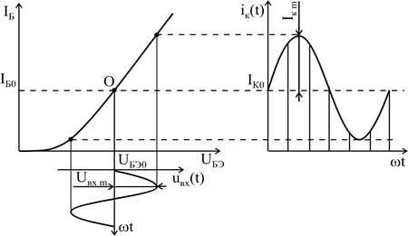 Рис.12.7. Угол отсечки – половина части периода, выраженная в радианах или градусах, в течение которой транзистор открыт и через него протекает ток. Из-за нелинейности начального участка ВАХ активного элемента форма входного и выходного токов существенно отличается формы, соответствующей линейному элементу (рис. 12.8.). Для усиления другой полуволны входного сигнала используют еще один транзистор, такой усилитель называется двухтактным. Режим класса В характеризуется большими нелинейными искажениями сигнала (Кг £ 10 %), обусловленными работой на нелинейных начальных участках ВАХ транзистора и высоким КПД. Максимальный КПД имеет величину 78 %. Режим класса АВ. Ток в выходной цепи активного элемента протекает в течение промежутка времени больше половины периода входного сигнала. Угол отсечки достигает 120¼ 150°.