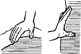 Большое многообразие форм расчлененного скального рельефа требует соответствующих приемов для их прохождения. Наиболее надежны и удобны захваты небольшого выступа, когда все пальцы обхватывают его с разных сторон. Если выступ небольшого размера в виде полочки и за него можно зацепиться только сверху концевыми фалангами двух-трех пальцев руки, он называется зацепкой (рис. 198). В тонкую вертикальную трещину можно засунуть два-три пальца и расклинить их, упираясь большим пальцем в стенку (рис. 199, а) или в край трещины (рис. 199, 6). Можно осуществить распор о скалу (рис. 199, в). В более широкой трещине можно заклинить кисть руки (рис. 199, г), осуществить распор большим пальцем, подложив его под ладонь (рис. 199, д), или всей ладонью (рис. 199, е). Расщелину шириной с кулак проходят, как и трещину шириной в ладонь, путем постепенной перестановки рук. В такую трещину легко входит раскрытая ладонь, затем сжатая в кулак (рис. 199, ж). Часто рука в трещину входит ладонью вниз (рис. 199, з) или вверх (рис. 199, и). Сжатый боковыми стенками трещины, кулак без особых усилий удерживает вес тела. В отдельных случаях узкую расщелину удобнее использовать как бы на разрыв (рис. 200). Часто применяемая форма использования точек опоры — положение в упоре (рис. 201).