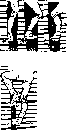 В любом случае до использования точки опоры ее следует проверить и не допускать ошибок в приложении нагрузки на нее (рис.202). Часто приходится лезть по трещине боком, заклинивая в ней предплечье или плечо. Всовывая руку в глубь трещины, заклиниваем локтевой сустав (рис. 203). Свободная рука снаружи трещины отыскивает точки опоры для продолжения движения. Свободную ногу также передвигаем вверх по трещине.