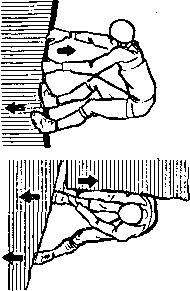 Устойчивое положение ноги может быть создано путем заклинивания ступни или всей ноги в вертикальную расщелину. Вертикальную расщелину можно использовать как ряд хороших ступенек путем поочередного заклинивания ступни (рис. 206). Две сходящиеся под тупым углом скальные плоскости образуют так называемый внутренний угол. Наличие уступов и захватов представляют удобную возможность движения во внутреннем углу на распорках. Правая рука и нога находят опоры на своей стороне угла, левая рука и нога — на противоположной (рис. 207). Внутренние углы, имеющие на стыке стен достаточно широкие трещины, отколы от основного массива, отслоившиеся плиты, проходятся так: широко расставленные ноги упираются в стену угла, а руки, держащиеся за откол, тянут его на себя (рис. 208). Порядок движений: рука — нога, нога — нога. Такая техника требует значительных физических усилий. Часто с помощью упоров можно пройти внутренние углы с гладкими стенами, а также скальные желоба.