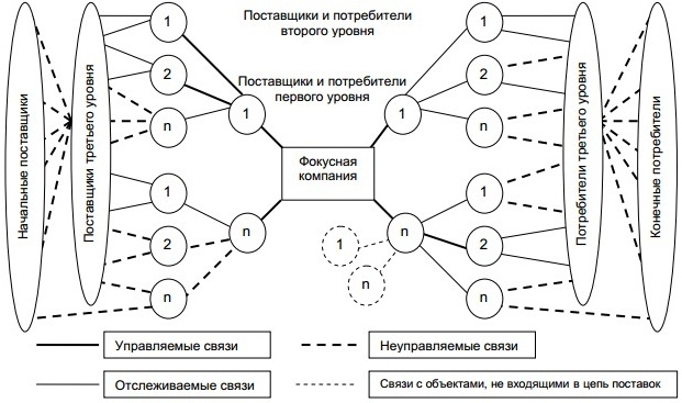 Границы – входы и выходы любого отдельно взятого процесса. Первичные / начальные границы – там процесс начинается – исходный поставщик ЦП. Процесс заканчивается выходом, который выдает результат конечному потребителю. Пример: первичным входом в процессе управления сбытом мб подтверждение сделанного заказа, а первичным выходом – предъявление платежных документов к оплате в кредитном учреждении. После начала процесса у него может появиться значительное количество вторичных входов. Т.е. необязательно бизнес-процесс имеет только один вход и один выход. Например, управленческая информация, которую предоставляет отдел информационных систем, может понадобиться на различных стадиях. Точно так же, как существуют вторичные входы, существуют и вторичные выходы. Они получаются как побочные продукты процесса и не являются его главной целью. Пример: отчет о количестве сверхурочного времени, проработанного персоналом. Вторичные выходы обычно инициируют другие процессы. Пример: сверхурочное время мб началом процесса начисления заработной платы. Определение границ сетевой структуры требует времени и $. Ограничение сетевой структуры ЦП позволяет снижать затраты, длительность цикла и уровень ошибок. Типы связей (с точки зрения фокусной компании): · Управляемые – на них ФК оказывает непосредственное влияние; · Неуправляемые – на нихФК не обращает внимания; · Отслеживаемые – за ними ФК следит, но не может непосредственно влиять; · Не входящие в ЦП – например, связи контрагентов с конкурентами ФК. 3 структурные размерности цепи: 1. Положение фокусной компании по отношению к границам сетевой структуры. Центр сетевой структуры может быть расположен в центре, а может быть смещен как в сторону поставщиков, так и в сторону конечных потребителей. Ближе к поставщику: · Сельское хозяйство · Обработка руды, металлов · Деревообрабатывающая, целлюлозно-бумажная промышленность Ближе к потребителю: · Любые услуги · Торговля (если рассматривать точку сбыта как фокусный центр) 2. Горизонтальная структура характеризует число уровней поставщиков и потребителей в цепочке поставок. III – II – I – Ф/К – I – II – III Чем больше уровней в цепи поставок, т. е. чем больше количество ее звеньев (участников), тем она длиннее. Чем меньше, тем она короче. 3. Вертикальная структура определяется числом поставщиков или потребителей, входящих в каждый уровень, т.е. цепь поставок может иметь узкую вертикальную структуру с небольшим числом компаний на каждом уровне или широкую вертикальную структуру, когда в каждый уровень входит много поставщиков или потребителей. Влияние на изменение горизонт. и вертик. параметров сети также будет оказывать и при-нятие решения об аутсорсинге. Аутсорсинг: исходим из ограниченных возможностей ФК влиять на интеграцию и управление бизнес-процессами за ее пределами в рамках ЦП. Если широкая вертикальная структура, ФК может активно управлять не всеми связями. Аутсорсинг – смена управляемых связей на отслеживаемые. Этот принцип, известен как функциональное отделение и может применяться как в отношении сети поставщиков центральной компании, так и в отношении ее потребителей.
