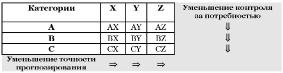 Исходя из практики, категории СХ, CY, CZ управляются одинаково, планирование таких запасов происходит обычно на год, с ежемесячной проверкой наличия на складе. В управлении категориями ВХ, BY, BZ применяются как одинаковые, так и разные подходы к срокам планирования и способам доставки. Для категорий АХ, AY, AZ всегда вырабатываются индивидуальные способы управления. Например, для категории АХ можно рассчитать оптимальный размер закупок и применить технологию «точно в срок». А для категории AZ при нерегулярном потреблении точный расчет невозможен, значит следует формировать резервный запас.