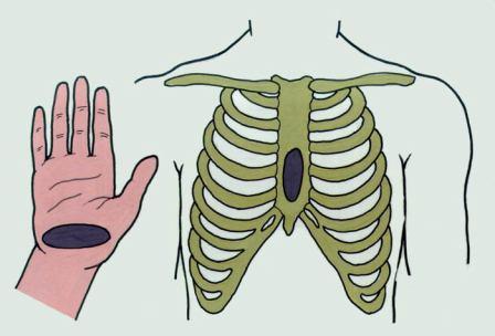 Рис. 2.5. Место соприкосновения руки и грудины при непрямом массаже сердца