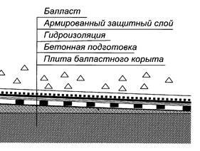 ПРОЕЗЖАЯ ЧАСТЬ И МОСТОВОЕ ПОЛОТНО ЖЕЛЕЗНОДОРОЖНЫХ И АВТОДОРОЖНЫХ МОСТОВ Верхнее строение пути железнодорожных и мостовое полотно автодорожных и городских мостов Верхнее строение пути железнодорожных мостов На железобетонных мостах путь, как правило, устраивается на щебеночном балласте, что обеспечивает однородность пути на мостах и на подходах. При этом на мостах может использоваться бесстыковой путь. Конструкция мостового полотна должна обеспечивать возможность прохода колес подвижного состава в случае схода их с рельсов, а также содержание и ремонт пути с использованием средств механизации. Балласт укладывается по армированному защитному слою, предохраняющему гидроизоляцию от непосредственного механического воздействия со стороны балласта. В последнее время защитный слой стали выполнять из жестких полимерных плит «Пеноплекс», поверх которых укладывается слой геотекстиля «Дорнит» (рис. 16.1).