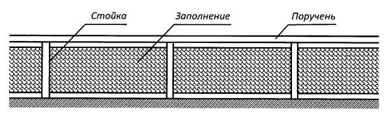 Рис. 16.8. Установка парапетного ограждения на устое Парапетные ограждения крепятся путем установки их на основание на цементном растворе с применением металлических штырей (пиронов), поставленных также на растворе в сравнительно неглубокие (до 10 см) гнезда. Также пиронами производится и соединение отдельных блоков — плит парапета между собой. Недостатком парапетных ограждений является их большой вес, значительно (по сравнению с другими типами ограждений) увеличивающий стоимость перевозки и монтажных работ. Значительной является нагрузка от этих ограждений на тротуарные консоли. Стоечные ограждения состоят из стоек, закрепленных в плите проезжей части (в тротуарных консолях), поручня и перильного заполнения, устанавливаемого между стойками (рис. 16.9).