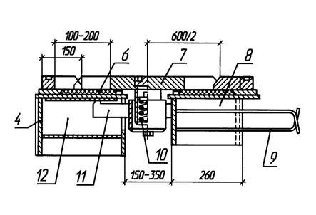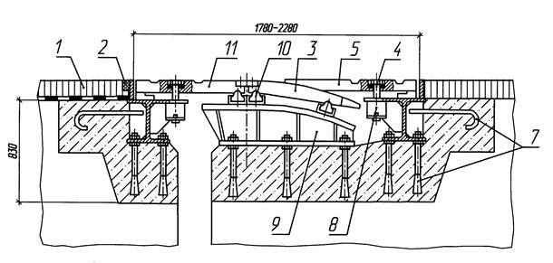 Рис. 16.30. Откатной деформационный с шарнирно-сочлененными откатными плитами 1 – покрытие проезжей части; 2 – окаймление; 3 – скользящий лист; 4 – стакан для пружины; 5 – опорный столик; 6 – антифрикционный материал (фторопласт); 7 – откатная плита; 8 – резиновые опорные прокладки; 9 – переходная плита; 10 – пролетное строение; 11 – водоотводный лоток