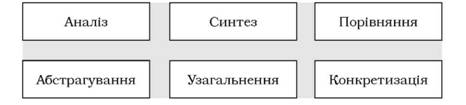 Аналіз — мислительний поділ предмета, явища на складові частини, ознаки, властивості та виділення цих компонентів. Синтез — мислене поєднання в єдине ціле окремих частин, ознак, властивостей предметів, явищ або понять. Порівняння — встановлення схожості і відмінності між предметами, явищами та їх компонентами. Узагальнення — виділення на підставі порівняння головного, загального, особливого або часткового, що може бути характерним для певного явища, предмета, об'єкта. Абстракція — мислене виділення суттєвих особливостей групи предметів, явищ або понять, їх компонентів з абстрагуванням від несуттєвих ознак. Конкретизація — перехід від загального до часткового, зв'язок теорії з практикою, розкриття окремих положень на прикладі існуючого в об'єктивному світі предмета, явища, перехід до конкретної дійсності, до чуттєвого досвіду, сприяння кращому пізнанню дійсності.