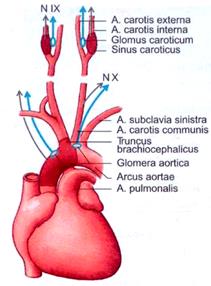 Афферентная импульсация от них проводится по нерву Циона—Людвига (ветвь X нерва) от аортального тельца и нерву Геринга (ветвь IX нерва) от каротидного тельца;