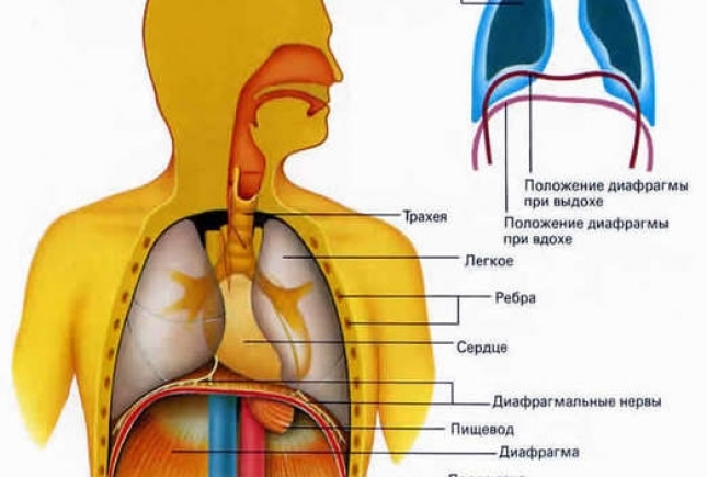 Упражнение №1. Лежа на спине необходимо расслабиться и не делать ничего специального. В таком положении необходимый нам тип дыхания появляется сам, физиологически. Одну руку положить на среднюю часть диафрагмы, на область «солнечного сплетения» (Диафрагма – перегородка, отделяющая грудную полость от брюшной), другую руку на середину грудной клетки. Когда удастся расслабиться, рука, лежащая на диафрагме, начнет подниматься при вдохе и опускаться при выдохе. Далее, сохраняя данный тип дыхания, на выдохе нужно тянуть сначала согласные с, ф, ш, х, а затем гласные и-у-э-о-а.