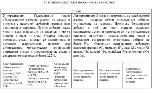Сталь, не содержащая легирующих компонентов. В зависимости от содержания углерода У. с. подразделяют на низкоуглеродистую (до 0, 25% С), среднеуглеродистую (0, 25—0, 6% С) и высокоуглеродистую (более 0, 6% С). Различают У. с. обыкновенного качества и качественную конструкционную. К 1-й группе относится горячекатаная (сортовая, фасонная, толстолистовая, тонколистовая, широкополосная) и холоднокатаная (тонколистовая) сталь; во 2-ю входят горячекатаные и кованые заготовки диаметром (или толщиной) до 250 мм, калиброванная сталь и Серебрянка. У. с. выплавляют в мартеновских, двухванных, дуговых печах и кислородных конвертерах. Для раскисления У. с. используют ферромарганец, ферросилиций, феррованадий, алюминий, титан и др.; по степени раскисления различают кипящую, полуспокойную и спокойную ЛЕГИ́ РОВАННАЯ СТАЛЬ, углеродистая сталь, в которую специально введены легирующие элементы с целью улучшения ее эксплуатационных и технологических свойств. Различают низколегированную (суммарное содержание легирующих элементов до 2, 5%), среднелегированную (2, 5—10%) и высоколегированную (свыше 10%) сталь. Легирующие элементы вводятся в сталь в различных количествах и в разных сочетаниях — по 2, по 3 и более элементов. Легированные стали используют для изготовления тяжелонагруженных деталей ответственного назначения, так как они обладают более высокими механическими характеристиками. В отличие от маркировки углеродистых сталей буквы в марке низколегированных сталей показывают наличие в стали легирующих примесей, а цифры — их среднее содержание в процентах. Предшествующие буквам цифры показывают содержание углерода в сотых долях процента. Для маркировки стали каждому легирующему элементу присвоена определенная буква:
