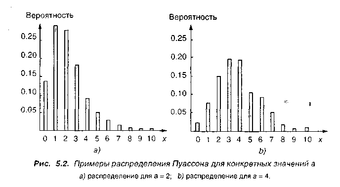 Р (х) = e-a ax / x! для x = 0, 1, 2, 3, 4... (5.1) где Р (х) – вероятность х прибытий; х – число прибытий в единицу времени; a – среднее количество прибытий; е – основание натурального логарифма 2, 7183. С помощью таблицы эти значения легко вычислить. Рис. 5.2 иллюстрирует распределение Пуассона для a = 2 и a = 4. Это означает, что если среднее количество прибытий заказчиков в час a = 2, то вероятность прибытия 0 заказчиков за любой случайный час – около 13 %, вероятность прибытия одного заказчика – около 27 %, двух – около 27 %, трех – около 18 %, четырех – около 9 % и т. д. Шансы, что появятся девять или более заказчиков, практически нулевые. Такие прибытия, конечно, не всегда распределяются по закону Пуассона (они могут распределяться и иначе), и, прежде чем применять это распределение, следует удостовериться, что эти прибытия хорошо апроксимируются распределением Пуассона. Поведение прибытий. Большинство моделей очередей полагают, что приходящие заказчики являются «терпеливыми». Терпеливые клиенты – это люди или машины, которые ожидают своей очереди до тех пор, пока их не обслужат, и не меняют очередь. К сожалению, жизнь сложнее, поскольку люди не всегда бывают терпеливыми. Клиенты, которые являются нетерпеливыми, отказываются присоединиться к очереди, потому что она слишком длинная, что не соответствует их запросам и интересам. Другая разновидность нетерпеливых клиентов – это те, которые, становясь в очередь, затем оказываются нетерпеливыми и покидают ее без завершения действия. Действительно, обе эти ситуации только подчеркивают необходимость теории очередей и анализа ожидания в очередях. 2. Характеристика очереди. Сама по себе очередь ожидания – это второй компонент системы очередей. Длина очереди может быть или ограниченной, или неограниченной. Очередь является ограниченной, если она не может по закону или физическим ограничениям увеличиваться до бесконечности. Это может быть в случае небольшой парикмахерской, которая имеет только ограниченное количество мест для ожидания. Аналитические модели очередей, рассматриваемые в этой главе, работают с неограниченными по длине очередями. Очередь является неограниченной, если нет ограничений на ее размер, как в примере обслуживания прибывающих автомобилей. Вторая характеристика очередей относится к дисциплине очереди. Это касается правила, по которому клиенты в очереди получают обслуживание. Большинство систем использует дисциплину очереди, известную как правило: «первый пришел – первый ушел» (FIFO). В госпитале или в супермаркете на экспресс – узле расчета различные приоритеты могут не соответствовать правилу FIFO. Пациенты в госпитале, которые находятся в критическом состоянии, могут идти вперед с приоритетом на обслуживание по сравнению с пациентами с легкими травмами. Покупатели менее чем с десятью покупками могут проходить на экспресс-узел расчета (но тогда они обслуживаются, как «первый пришел – первый обслужен»). Выполнение компьютерных программ – другой пример систем очередей, которые работают по распределению приоритетов. В большинстве крупных компаний, если компьютер выписывает платежное поручение на конкретную дату, платежная программа имеет наивысший приоритет перед другой программой. Термин FIFS («первый пришел – первый обслужен») используется как заменитель FIFO, а другая дисциплина LIFS («п