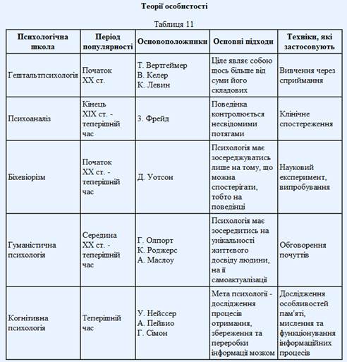 Дослідження особистості налічує майже дві з половиною тисячі років. Проте, психологія особистості як наука склалася порівняно недавно. В історії досліджень особистості виділяють такі періоди. V ст. до н. е. - поч. XIX ст. - філософсько-літературний період (Сократ, Аристотель, Спиноза, Локк, Юм), протягом якого основними проблемами психології особистості були питання моральної і соціальної природи людини, її вчинків і поведінки. Поч. XIX ст. - XX ст. - клінічний період (Фрейд, Адлер, Юнг). У цей період в центрі уваги психіатрів опинилися психічні чинники виникнення й перебігу хвороб, впливу хвороб на особистість, психологічні аспекти цілющих дій. Поч. XX ст. - теперішній час - експериментальний період (Лазурський, Айзенк, Кеттел, Олпорт), який характеризується активним впровадженням в психологію експериментальних методик досліджень психічних явищ з метою позбавитися умоглядності й суб'єктивізму в їх поясненні. В процесі диференціації напрямів дослідження особистості, що відбувався в першій половині XX ст., склався цілий ряд теорій особистості: гештальтпсихологічна, психоаналітична, гуманістична, біхевіористична, когнітивна (табл. 11).