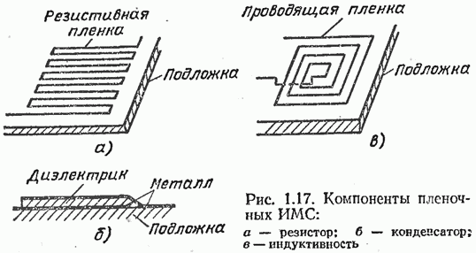 Рис. 1.17. Компоненты пленочных ИМС: а — резистор: б — конденсатор; в — индуктивность Пленочные конденсаторы имеют структуру, разрез которой показан на рис. 7. Конденсатор состоит из трех пленочных слоев: металл — диэлектрик — металл. За счет малой толщины диэлектрика емкость пленочных конденсаторов достигает 8 и более. Дроссели могут быть выполнены в виде спирали (рис. 1.17, в); они имеют небольшую индуктивность, не более 9. Бескорпусные полупроводниковые приборы, конденсаторы больших номиналов и магнитные элементы в гибридных ИМС выполняются навесными: эти элементы приклеиваются в определенных местах к плате, осуществляется их контактирование с элементами пленочной схемы, затем плата с пленочной схемой и навесными элементами помещается в герметизированный корпус, имеющий определенное количество выводов. Гибридные ИМС обладают следующими основными свойствами: 1. Наиболее предпочтительными элементами являются пассивные компоненты (резисторы и конденсаторы), число навесных элементов в ИМС должно быть небольшим, так как их установка и монтаж требуют больших затрат труда. 2. Точность воспроизведения параметров в гибридных ИМС значительно выше, чем полупроводниковых. Возможна подгонка номиналов резисторов и конденсаторов (например, путем соскабливания части пленки). 3. Технология гибридных ИМО значительно проще технологии полупроводниковых. Гибридные ИМС делятся на тонкопленочные, в которых пленки создаются методом термовакуумного напыления, и толстопленочные, в которых пленки получают путем нанесения пасты через трафарет с последующим спеканием в печи. Технология толстопленочных ИМС сравнительно проста, и их выпуск может быть налажен в стенах лаборатории или производственного участка. 4. Стоимость подготовки к выпуску нового типа гибридных ИМС меньше, чем полупроводниковых, поэтому экономически оправдан выпуск гибридных ИМС малыми сериями (сотни и даже десятки экземпляров). 5. Массогабаритные показатели гибридных ИМС хуже, чем у полупроводниковых, и число компонентов в одной схеме обычно не больше нескольких десятков. Полупроводниковые ИМС в основном являются ИМС общего применения, т. е. выпускаются в виде типовых элементов для различных областей использования, обладают универсальными достоинствами, что обеспечивает их высокий тираж. Гибридная технология особенно предпочтительна при разработке ИМС частного применения, т. е. для решения какой-то определенной задачи. В этом случае тираж ИМС обычно невысок, и экономически выгоднее выпуск гибридных ИМС. Число компонентов, заключенных в одном корпусе ИМС, называют степенью интеграции N.