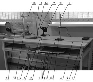 Внешний вид стенда представлен на рисунке 1. Стенд представляет собой стол со столешницей1, на которой размещаются бытовой электрокамин2, индикаторный блок 3, линейка4, стойки 5 для установки сменных экранов6, стойка 9 для установки измерительной головки 7 измерителя тепловых потоков, вентилятора 8, водяного насоса14, душ 10, емкость с водой 11. Стол выполнен в виде металлического сварного каркаса со столешницей и полкой, на которой хранятся сменные экраны6. Бытовой электрокамин2 используется в качестве источника теплового излучения. Вентилятор8 используется в качестве источника" воздушной завесы" и устанавливается на стойке 12 с помощью хомута13. Металлические стойки 5 для установки сменных защитных экранов 6 обеспечивают их оперативную установку и замену. Для установки измерительной головки 7 служит вертикальная стойка 9, закрепленная на плоском основании 15.На стойке 9 с помощью струбцины16 с винтами крепится измерительная головка 7. Стойку можно вручную перемещать по столешнице вдоль линейки4. Стандартная металлическая линейка 4 предназначена для измерения расстояния от источника теплового излучения (электрокамина2) до измерительной головки 7 и жестко закреплена на столешнице1. Водяной насос14, душ 10 и емкость с водой 11 служат для создания«водяной завесы»совместно со стеклянным экраном 6. Душ10 крепится к стойкам 5 при помощи двух хомутов 17. Сменные экраны6 имеют одинаковый размер, что позволяет поочередно устанавливать их между стойками5. Металлические экраны выполнены в виде листов металла с направляющими.Экраны с цепями и брезентом выполнены в виде металлических рамок, в которых закреплены стальные цепи или брезент. На левой боковой поверхности стола расположены выключатели18, которые позволяют подключать к сети переменного тока электрокамин2, вентилятор8, измеритель теплового потока ИПП-2М и водяную помпу14.