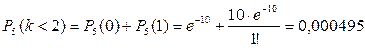 Это событие практически невозможно. в) События «поступило менее двух вызовов» и «поступило не менее двух вызовов» противоположны, поэтому искомая вероятность того, что за5мин поступит не менее двух вызовов, равна: P 5(k ≥ 2) = 1 – P 5(k < 2) = 0, 000495=0, 999505. Это событие практически достоверно.