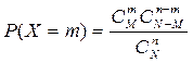 Прежде чем дать определение гипергеометрического распределения, рассмотрим задачу. Пусть в партии из N изделий имеется М стандартных (М < N). Из партии случайно отбирают п изделий (каждое изделие может быть извлечено с одинаковой вероятностью), причем отобранное изделие перед отбором следующего не возвращается в партию (поэтому формула Бернулли здесь неприменима). Обозначим через X случайную величину – число т стандартных изделий среди п отобранных. Очевидно, возможные значения X таковы: Найдем вероятность того, что Х = т, т.е. что среди п отобранных изделий ровно т стандартных. Используем для этого классическое определение вероятности. Общее число возможных элементарных исходов испытания равно числу способов, которыми можно извлечь п изделий из N изделий, т. е. числу сочетаний СNn. Найдем число исходов, благоприятствующих событию Х = т (среди взятых п изделий ровно т стандартных); т стандартных изделий можно извлечь из М стандартных изделий СNm способами; при этом остальные п - т изделий должны быть нестандартными; взять же Искомая вероятность равна отношению числа исходов, благоприятствующих событию Х = т, к числу всех элементарных исходов