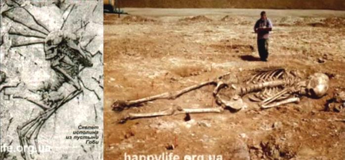 Скелет гиганта из пустыни Гоби(слева), с неким подобием крыльев и очень длинными пальцами, и (справа) люди гиганты, нефилим, жившие на Земле. А ведь это уже археологические находки!!!