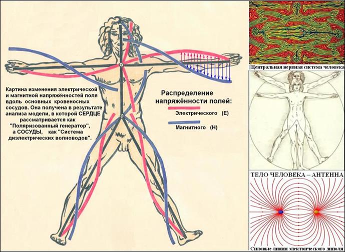 С этой точки зрения привлекательна концепция основоположника советской космической биологии В.В.Парина – разрабатывать принципиальные схемы процессов управления, протекающих в живой природе, по аналогии с техническими устройствами (начало 60-х годов). Многие эксперименты и работы в биологии и физиологии свидетельствуют, что наряду с нервной и гуморальной системами в живом организме те же функции реализуются и при помощи электромагнитных (ЭМ) полей. Примечательная закономерность была обнаружена в экспериментах. Эффекты от воздействия ЭМ полей, мало зависят от энергии излучения. Даже более того, соответствующие закономерности нередко носят парадоксальный характер: влияние поля с меньшей энергией оказывается более сильным. Это значит, что в теле человека, его жизненно важных узлах должны быть генераторы периодически изменяющейся энергии вполне определённых частот, значит должно существовать и явление резонанса – усиление слабых колебаний, на чём построена вся радиотехника. Роль регулятора в организме всех теплокровных существ выполняет сердечно-сосудистая система. Физиологи давно установили, что автоматизм сердца – процесс не только механический, но и электрический. Попеременное сокращение и расслабление сердечной мышцы сопровождается чрезвычайно быстрыми чередованиями положительных и отрицательных зарядов в её тканях. На электрокардиограмме отражаются не сами эти ВЧ колебания, а их огибающая. Природа поляризации, то есть быстрых чередований положительных и отрицательных зарядов, не вполне ясна. Вероятно, в мышцах сердца содержится вещество, обладающее пьезоэффектом. Как следуя далее, в модели, предложенной московским радиофизиком А.Г.Телегиной, сердце предстало в виде поляризационного генератора, а быстро колеблющиеся заряды, как известно, служат источником электромагнитного поля. Кровь, мышцы, нервы и другие структуры предстали как диэлектрики. Часть работы совершаемой энергией ЭМ поля при его распространении по диэлектрику, превращается в тепло (потери). Они и способствуют поддержанию температуры тела на достаточно высокой отметке. В рамках описываемой модели артериальные и венозные сосуды рассматриваются как две системы диэлектрических волноводов. В диэлектрическом волноводе ЭМ волны не отражаются от стенок, как скажем, в стальном, а распространяются и внутри, и за его пределами. Особенность подобного волновода – высокая чувствительность к перегибам и деформациям, т.е. нарушается картина распространения ЭМ волны. Поэтому когда снимают ЭКГ, просят лечь, выпрямить конечности и расслабиться. Аналогично поступают экстрасенсы, йоги, когда заряжаются праной-энергией. Однако полный сюрприз круглого диэлектрического волновода, это правило чередования максимумов электрической (Е) и магнитной (Н) напряжённости вдоль его оси. Так в сосудах, идущих от сердца к голове, укладывается четверть волны, в правую и левую руки – по одной полуволне, в ноги по три четверти, как показано на рисунке. Сама по себе длина волны, определяется размерами нашего организма, и будет равна росту человека, или, что то же самое, размаху его вытянутых рук. Если бы речь шла о распространении ЭМ колебаний в вакууме, то их частоту можно было бы получить, разделив скорость света на длину волны: F = C / λ. Но мы имеем дело с диэлектрической сре
