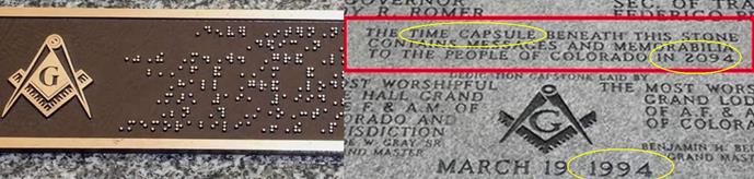 Вот первые три строчки Большой Ложи Колорадо Мирового Масонства, написанные шрифтом Брайля: «Denver International Airport. Dedication Capstone by The M.W. Grand Lodge Of Colorado». Ещё более удивляет надпись, сделанная на доске, подписанная некой комиссией Аэропорта Нового Мира. Слышали ли вы о такой организации раньше? Нет? Я тоже. Потому, что такой организации не существует в природе. Тогда почему она фигурирует на мемориальной доске в качестве создателя данного аэропорта? Ох, как и дурят этих глупых и самовлюблённых амеров...