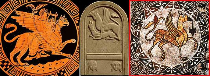 Грифон, попирающий змея – один из самых распространённых сюжетов изобразительного искусства древних славян. Грифон в символике многих традиций является врагом преходящего, тленного, хранителем чистоты и всего, что принадлежит вечности. Этих существ даже пытались классифицировать. Средневековый немецкий учёный Х.Принц разде-лил их на три вида: грифон-птица, грифон-змея и грифон-лев. Но другие авторы того времени оспа-ривали такое разделение, ведь последние два экземпляра обычно изображались с телом, покрытым чешуйками, а значит, являлись родственниками драконов. Считалось, что только грифона-птицу можно отнести собственно к грифонам. Гиппогриф – это чудовищный гибрид орла и лошади. Он имеет уши, шею, гриву, туловище и задние ноги лошади. Крылья, передние конечности и голова как у орла. Гиппогрифы, возможно, были созданы как естественная добыча для грифонов. Гиппогрифы также связаны с пегасами. Поскольку гиппогрифы едят мясо, пегасы избегают их компании. Гиппо-грифы превосходные летающие скакуны, и менее опасны, чтобы съесть наездника, чем грифоны. Грифоном может называться не только существо с львиным туловищем и крыльями и головой орла, а и другие комбинации этих животных. Различают " львиных грифонов", т.е. существ с телом льва, крыльями, иногда передними лапами как у орла, но с головой льва, и " орлиных грифонов", т.е. классических грифонов - с телом льва, крыльями и головой орла. В наиболее широком смысле, слово " грифоны" может употребляться практически ко всем соединениям четвероного животного с птицей, не поддающимся однозначной идентификации. Самое древнее из известных сегодня изображений грифона обнаружено возле города Шуша (на территории современного Ирана). Этот зверь был запечатлён на печати, сделанной около 3000 года до н.э. Конечно, не всех существ, сочетающих черты птицы и четвероногого причисляют к " грифонам", существуют и вполне определённые образы, чётко отделяемые от грифонов, вроде Имдугуда — " грифона наоборот".