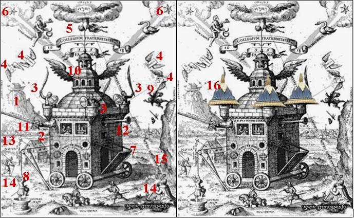 Мы специально сохранили английскую версию и «перевод». В контексте делается вывод, что эти новые звёзды возвестили рождение Общества Розенкрейцеров (!!!), или, по крайней мере, его возрождение в 1604 году. Здесь даже просматривается некая полностью символичная параллель с масонской аллегорией Хирама Абиффа. Хотя в обоих текстах, везде подразумевается эзотерическая и тайная версия, которую розенкрейцеры передавали из уст в уста – для ограниченного числа адептов и посвящённых. Хотя догадаться можно и так. Вольно цитируем: « Да, Господь Бог уже заранее отправил завербованных «богоизбранных» лазутчиков и паникёров, которые должны были передать условия капитуляции и Его Волю. Однако появившиеся НОВЫЕ Силы со звёзд Змееносца и Лебедя, проявили твёрдость в борьбе, и дают о себе знать каждому, что они являются мощным Союзником в решении больших и весомых вопросов ». Неожиданный и богохульный ракурс и смысл. Люди Земли противились Воле Господа, и приняли бой. Силы были явно неравны, что на стороне землян выступили союзники с созвездий Змееносца и Лебедя. Битва была проиграна. Яхве (написано на облаке) применил мощное оружие (Гнев Божий), уничтожившее почти всё население планеты, устроив, как следствие Всемирный Потоп (Ковчег на горе), а оставшейся части живых пришлось спасаться под землёй (человек залезает в колодец). Что было дальше, мы знаем. Потоп, истребление народов, жёсткий геноцид, моры и язвы, голод, истребление младенцев, уничтожение центров культуры и памяти, уничтожение истории и библиотек, тотальная переделка истории и подмена понятий, и ценностей, всеобщее оболванивание, и зомбирование выживших, инквизиторское насаждение своих религиозных процедур и жертвоприношений. И ОНИ ещё заставили нас считать их «своими богами», чтобы мы не разгибая спины, батрачили на дармоедов. Они стали победителями. Победителей ведь не судят, а надо бы. Но давайте более подробно разберёмся в эзотерическом аспекте данной граммы розенкрейцеров: