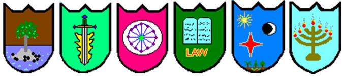 У колен, зачастую было несколько символов, как у Гада – Башня, Лагерь, Рука мечом, у Леви – был ЛЕВ, перешедший позднее в Грифона, и цветок Мандрагоры. Потом художник-алиен, только спрашивал заказчика, что лучше мистика с Грифоном, или видя склонность к ботанике – тогда Мандрагору. А сверху, уже географический прибамбас: в Украине – обязательно Башню, в России - Двухголовую Курицу, Брит-Анский регион – обязательно Льва Иуды, ну и желательно скованного Единорога. Ну и ПОВЕРХ всего, самое сокровенное – Корона Торы. Потом свободные места заляпать символами – Мохендовидами (желательно побольше), или полумесяцами. Внизу на ветках Дуба, Винограда, закинуть вытянутый флаг с Девизом. Так что друзья, прочитав этих два абзаца, вы стали спецом по геральдике. Что забыли – цвет, или девиз, посмотрите в табличках про 12 колен. Ах, ещё, забыли самое важное. Выкатить кругленький счёт заказчику. Чисто по-алиенски, да и весомее будет смотреться герб, что даже придаст ему некий ореол мистицизма и значимости.