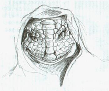 изогнутые как ваши, но мы можем слышать лучше, потому что наши уши более чувствительны, мы можем также услышать более широкий диапазон звуков. Есть мускулы (или можно их назвать " клапаны") в ушах, которые могут полностью заблокировать их (например, под водой). Наш нос - больше выраженный и более V-образная выемка, изгибающаяся между ноздрями, которая позволяет " видеть" температуру. Мы потеряли большинство этих способностей, но всё ещё чувствуем температуру намного лучше с этим " органом". Наши губы сформированы, как и ваши (женские немного больше мужских), но бледного коричневого цвета. Наши зубы очень белы, сильны и немного более длинны, и более остры, чем ваши мягкие зубы млекопитающего. Мы не имеем никаких различных цветов волос как Вы (но есть традиция, красить волосы в различных возрастах), и оригинальный цвет подобен моему сейчас – зеленовато-коричневый. Наши волосы более толстые, прочнее, чем ваши и растут очень медленно. Кроме того, голова - единственная часть нашего тела, где мы имеем волосы. Наше тело, руки и ноги подобны по форме и размеру вашим, но цвет отличный (зеленовато-бежевый, как лицо) и подобны по масштабу, структуре верхних частей ног (от колена) и верхней части от ладони до локтя. Наши пять пальцев являются немного более длинными и более тонкими, чем человеческие пальцы и наша кожа на пальцах ровная. Таким образом, мы не имеем никаких линий, как Вы, и вследствие ни каких отпечатков пальцев, но подобная форма и масштаб структуры кожи и плюс, коричневые точки (оба пола имеют точки на ладонях). Если Вы коснётесь моей кожи, то Вы будете чувствовать, что это более гладкая, чем ваша волосатая кожа. Есть маленькие острые рожки наверху обоих средних пальцев. Ногти серые и вообще более длинны, чем ваши. Вы видите, что мои ногти не являются такими длинными и закруглены наверху. Это, потому что я женщина. Мужчины имеют острые резкие когти с длиной иногда 5 или 6 ваших сантиметров. Следующая особенность очень отличается от вашего тела и это специфичная часть нашего рептильного происхождения: если Вы коснётесь верхней части моей спины, то Вы будете чувствовать бугристую костистую линию даже через мою одежду. Это не мой спинной хребет, но очень твёрдое форменное образование внешней структуры - пластины кожи и ткани сверху нашего спинного хребта от головы до бедра. Там чрезвычайно большое число нервов и больших кровеносных сосудов, которые приблизительно от двух до трёх сантиметров длиной и очень тактильно чувствительны. Это причина, почему мы всегда имеем проблемы сидеть на стульях со спинкой, как этот стул. Главная роль этих маленьких пластин в определении нашей сексуальности и регулировании температуры нашего тела. Если мы находимся на естественном или искусственном солнечном свете, эти пластины заполняются кровью, и сосуды становятся более широкими, и Солнце в состоянии нагревать нашу кровь (которая циркулирует через тело и через пластины) это в сильной степени доставляет нам удовольствие. Чем же ещё мы отличаемся от вашего вида? О, мы не имеем никакого пупа, потому что мы родились различным путём. Другие внешние различия вашего вида незначительны, и я думаю, что я не должна перечислять всё теперь, потому что большинство из них не видимы, если мы носим одежду. Я надеюсь, что описание моего тела было детализировано достаточно. Я совет
