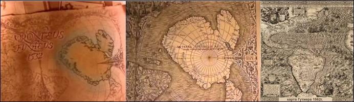 Загадка этой карты, обнаруженной в библиотеке конгресса США профессором наук Чарльзом Хэдвудом в 1932 году, составляет то, что она в точности отражает истинные границы Антарктики, скрытые под толщей льда. И она составлена Оронтеусом Финейским в 1532 году, задолго до того, как Антарктика вообще была открыта. Антарктиду открыли только в 1818. Геологи датируют возраст льда - 4000 до н.э. Мы же знаем, как Антарктика выглядит подо льдом только с 1952 года.