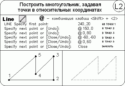 В двумерном пространстве точка определяется в плоскости XY, которая называется также плоскостью построений. Ввод координат с клавиатуры возможен в виде абсолютных и относительных координат. Ввод абсолютных координат производится в следующих форматах: • декартовы (прямоугольные) координаты. При этом для определения двумерных и трехмерных координат применяются три взаимно перпендикулярные оси: X, Y и Z. Для ввода координат указывается расстояние от точки до начала координат по каждой из этих осей, а также направление (+ или -). При начале нового рисунка текущей системой всегда является мировая система координат World Coordinate System (WCS), следовательно, ось X направлена горизонтально, ось Y – вертикально, а ось Z перпендикулярна плоскости XY; • полярные координаты. При вводе координат указывается расстояние, на котором располагается точка от начала координат, а также величина угла, образованного полярной осью и отрезком, мысленно проведенным через данную точку и начало координат. Угол задается в градусах против часовой стрелки. Значение 0 соответствует положительному направлению оси OX. Относительные координаты задают смещение от последней введенной точки. При вводе точек в относительных координатах можно использовать любой формат записи в абсолютных координатах: @dx, dy – для декартовых, @r Относительные декартовы координаты удобно применять в том случае, если известно смещение точки относительно предыдущей.