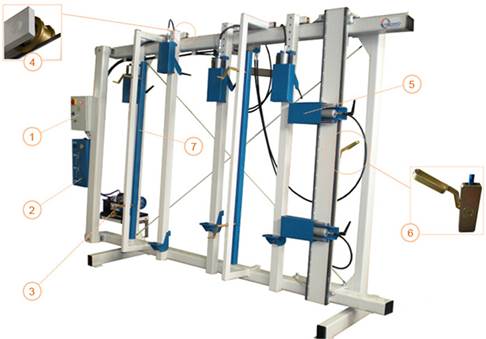 4. Склеивание бруса производится в гидравлической сборочной вайме ВС30х18. Гидравлическая сборочная ваймапредназначена для сборки окон и дверей. В комплектации с фронтальными прижимами возможно использование для склеивания щита. Элементы сборочной ваймы: 1. электрошкаф; 2. пульт управления гидрокомпонентами; 3. гидростанция; 4. роликовый узел перемещения прессующего блока; 5. горизонтальный прессующий блок; 6. фиксатор положения балки; 7. фронтальные прижимы для склейки щита.