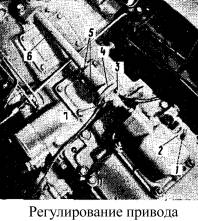 | Регулирование дистанционного привода управления механизмом переключения передач проводите при нейтральном положении рычага переключения передач в следующем порядке: — ослабьте стяжные болты 5 (см. рис. Регулирование привода) и, вывернув болты 3, обеспечьте зазор в соединении, навернув на один-два оборота регулировочный фланец 4 на тягу 6; — ослабив контргайку 1, вверните установочный винт 2, застопорив этим перемещение штока 7; -ослабив контргайку 1 (см. рис.Установочный винт и контргайка), вверните установочный винт 2, застопорив этим перемещение рычага переключения передач;