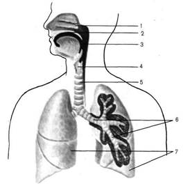 Рисунок 1 – Органы дыхания (схема). 1 – полость носа; 2 – полость рта; 3 – глотка; 4 – гортань; 5 – трахея; 6 – бронхи; 7 – легкие