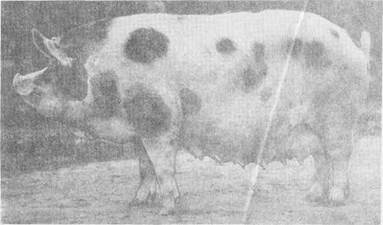 ница мускулистые (рис. 16); ноги прямые, правильно поставленные; кожа плотная, иногда со складками; щетина густая; масть белая, но иногда встречаются животные с пигментированной кожей. Взрослые хряки имеют массу 310—330 кг, свиноматки —- 220—240 кг; многоплодие маток 11—12 поросят; причем за год от них получают, как правило, два опороса. По данным Ярославского НИИ животноводства и кормопроизводства, откормочные и мясные качества свиней брейтовской породы характеризуются такими показателями: массы 100 кг животные достигают в возрасте 197 сут при среднесуточном приросте 683 г и затрате на 1 кг прироста 4, 16 корм, ед.; толщина шпика над шестым-седьмым грудным позвонком 37 мм; площадь «мышечного глазка» 28, 5 см2. В породе в настоящее время насчитывается 16 линий хряков и 24 маточных семейства. Лучшие из них линии Балета, Ветерка, Шомки, Шалуна и семейства Белянки, Чинары, Сливы, Калины. Племенная работа с животными брейтовской породы направлена на повышение мясных качеств, устранение некоторой сырости телосложения при сохранении высокой плодовитости и молочности. Совет по породе наметил в ближайшее время создать в плем- совхозах Ярославской области «Чебаково», «Дружба», «Городище», «Дроздовский» и на племенных колхозных фермах, а также в колхозе имени Кирова Смоленской области высококлассные чистопородные стада брейтовских свиней, селекционируемых по материнским признакам продуктивности и мясным качествам. Племенную продукцию этих стад предполагается использовать в Ярославской, Ленинградской, Псковской, Смоленской, Костромской, Ивановской и Челябинской областях. Северокавказская порода. Выведена в результате сложного воспроизводительного скрещивания местных кубанских, крупных белых, беркширских и белых короткоухих свиней. Работа по созданию породы была начата в 1935 г. Ново- черкасским зооветеринарным институтом (ныне Донской СХИ) под рукоиодством академика ВАСХНЙЛ П. Е. Ладана на Каялъ- кой опытной станции, а также в совхозах и колхозах Ростовской области и Краснодарского края. В это время на Северном Кавказе разводили в основном местных кубанских свиней, главными достоинствами которых были крепкая конституция, приспособленность к местным условиям и пастбищному содержанию, удовлетворительное многоплодие и хорошие материнские качества. Поэтому и решено было, сохранив все ценное от местных кубанских свиней, придать создаваемым на их основе животным новой породы высокую скороспелость и улучшить мясные качества. Работа по созданию породы успешно завершилась в 1955 г. Свиньи северокавказской породы характеризуются крепкой конституцией, универсальной продуктивностью, высокой скороспелостью и хорошей оплатой корма продукцией. Голова у них широкая; грудь глубокая и широкая, без перехвата за лопатками; ребра округлые; спина и поясница широкие, умеренной длины, прямые; крестец широкий, округлый, окорока хорошо выполненные, округлые, глубокие, спускающиеся до скакательного сустава; ноги крепкие, с твердым копытом; костяк тоньше, чем у свиней крупной белой и других пород, но более крепкий; щетина густая, мягкая, равномерно покрывающая все туловище. На зиму у многих животных вырастает густой мягкий подшерсток. Масть животных черно-пестрая (см. вклейку). В среднем взрослые хряки в племенных хозяйствах имеют массу 31 8 кг, свиноматки — 226 кг при дли