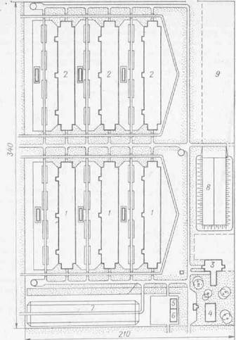 Разработано несколько типовых проектов маточных ферм и комплексов различной вместимости для разных зон страны. Так, для районов с расчетными наружными температурами до —30 °С создан типовой проект 819—143 овцеводческой фермы на 5000 маток с использованием долголетних культурных пастбищ (рис. 33). Внутрикощарное оборудование комплекса состоит из деревянных или металлических трансформирующихся щитов, бункерных самокормушек и автопоилок. Перед овчарнями устроены огороженные базы с 3-метровым кормовым проходом посередине для кормораздатчика. Вдоль кормового проезда установлены стационарные кормушки, а возле них устроена площадка с твердым покрытием из расчета 1, 5 м2 на овцу. На выгульных площадках • монтированы автопоилки АГК-4 с электроподогревом воды, л и овчарнях — автопоилки ГАО-4 или ПАС-2. Ферма рассчитана на производство шерсти и мяса. Содержание иней, пастбищно-стойловое: зимой — в овчарне со свободным но, 1 умом на базы; в летний период — на пастбищах. Пастбища рл: к*нты на загоны и имеют площадки для водопоя. Осеменение «.инк искусственное в два цикла. Сдача молодняка на убой в 7-ме- ■ ччпом возрасте. Кормление силосом, сенажем и комбикормами. Ре'.дача кормов мобильными кормораздатчиками КТУ-10, К V Г З.ОА. Убоока навоза бульдозерами. Имеются и другие проекты комплексов. Например, в Западной Сибири действуют овцеводческие комплексы с павильонной п блочной застройками овчарен по проектам СибНИПТИЖ,.рассчитанные на 1600—2800 маток. Предпочтение отдается комплексам с павильонной застройкой. В состав такого комплекса нходпт 6 овчарен, механизированный склад для гранулированных Кв|ШЭ8, профилакторий с комнатой отдыха, пункт искусственного м< смещения, ветеринарный пункт. Па комплексах применяются циклическая технология осеме- |п'; нпи и групповой метод ягнения. Кормят животных гранулами н I и, /юсом, что позволяет полностью механизировать раздачу ll I 1|1 мов. За последние несколько лет на новую технологию в ряде р.чГ'юнов РСФСР уже перешли не только отдельные хозяйства, но п целые административные районы, например Орловский, 1'< мом шеиский, Зимовниковский районы Ростовской области; Петровский', Ипатовский районы Ставропольского края; Кырин- ...... Читинской области; Соль-Илецкин Оренбургской области м ряд других. По данным Научно-исследовательского института онменодства и козоводства, физическая нагрузка на чабана на крупных комплексах снижается в 2, 5—3 раза по сравнению i работой в обычных отарах. 11а комплексно-механизированных фермах (комплексах) соз- | н.мся не только благоприятные условия труда, но также улуч- имп'ся режим отдыха и культурно-бытовое обслуживание работником овцеводства. Так, в госплемзаводе «Родинский» Алтайского | ран нее рабочие обеспечены жильем, там построены школы, eicKiie сады, дома культуры. В результате и экономические по- I I иелн этого хозяйства существенно улучшились. Комсомольск о чолодежная бригада, состоящая из 5 человек и обслуживающая 2057 маток, в 1985 г. от каждых 100 маток получила по I ю н вырастила к отбивке по 126 ягнят. Средний настриг шерсти " Пересчете па мытую составил 4, 01 кг при выходе 45, 3 %. Все чабанские бригады работают на коллективном подряде, причем каждая получаст хозрасчетное задание. При промышленной технологии приняты следующие системы содержания овец: пастбпщно-стойловая, стойлово-пастбищная н кр
