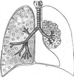 Встречается при сообщении бронхов с плевральной полостью (субплевральное расположение туберкулёзной каверны, абсцесса), при травме грудной клетки, спонтанном пневмотораксе или при искусственном введении в полость плевры воздуха с лечебной целью больным с кавернозным туберкулёзом. Жалобы: одышка, боль в грудной клетке. Общий осмотр: бледность кожных покровов, цианоз. Осмотр грудной клетки: выпячивание «больной» половины грудной клетки, в которой произошло накопление воздуха, сглаживание межрёберных промежутков, тахипное, отставание «больной» половины при дыхании. Пальпация: болезненность, ригидность поражённой половины грудной клетки. Голосовое дрожание резко ослаблено или не проводится. Перкуссия: громкий тимпанический звук иногда с металлическимоттенком. Аускультация: дыхание ослабленное везикулярное или не прослушивается. Бронхофония резко ослаблена или отсутствует. Рентгенологически: светлое лёгочное поле без лёгочного рисунка, а ближе к корню - тень спавшегося лёгкого. Исследование крови, мокроты: особых изменений не будет.