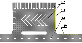 Примеры нанесения разметки 1.9 Разметка 1.10 Разметка 1.11 Линию 1.11 разрешается пересекать со стороны прерывистой, а также со стороны сплошной, но только при завершении обгона или объезда. Разметка 1.12 Разметку 1.12 наносят перед перекрестком при наличии знака 2.5 на расстоянии не более 1 метра от границы пересекающей проезжей части. При наличии транспортных светофоров расположенных на проезжей частью стоп-линия наносится на расстоянии 10-20 метра от светофора и 3-5 метра – при расположении сбоку от проезжей части для обеспечения видимости их сигналов. В зависимости от конфигурации пересечения допускается уменьшение указанные расстояния соответственно до 5 и 1 метра при наличии дублирующих светофоров любых исполнений. При наличии обозначенного пешеходного перехода разметку наносят на расстоянии не менее 1 метра перед переходом.