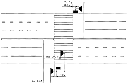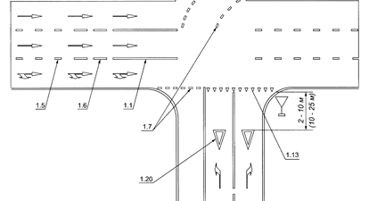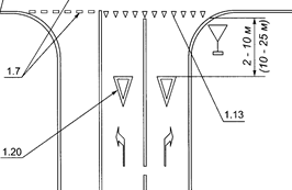 Пример нанесения разметки 1.19 Разметка 1.20 Расстояние между основанием треугольника разметки 1.20 и разметкой 1.13 составляет от 2 до 10 метров (от 10 до 25 метров).
