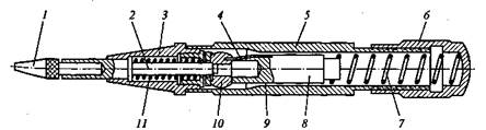1 – кернер; 2 – стержень; 3, 5, 6 – составные части кернера; 4 – плоская пружина; 7, 11 – пружины; 8 – ударник; 9 – заплечник; 10 – сухарь Рисунок 6 – Автоматический механический кернер