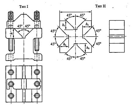 тип I – односторонняя; тип II – четырехсторонняя; h, h1, h2, h3, h4 – глубина V-образных пазов Рисунок 8 – Разметочные призмы