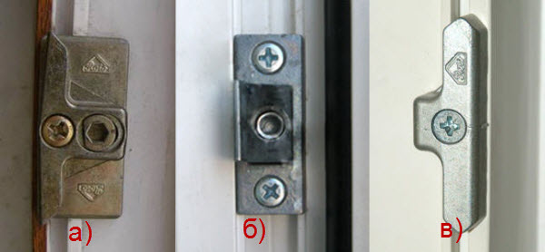 Рисунок 8 — Регулировка прижима окна ПВХ Некоторые виды фурнитуры регулируются исключительно с помощью расположенных со стороны ручки ответок (рисунок 9 — а). Положение ответных планок регулируется при помощи шестигранника. Для увеличения прижима створки окна к раме нужно сместить планку в сторону улицы. На раме со стороны петель также имеются регулируемые шестигранником прижимные механизмы (рисунок 9 — б, в). Чем больше вы выдвините язычок, тем створка будет сильнее прижиматься к раме.