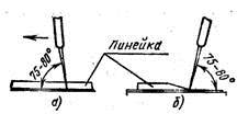 Во время нанесения рисок заостренный конец чертилки неотрывно прижимают к боковой стороне линейки, а линейку при этом плотно прижимают к заготовке. Риску проводят с небольшим нажимом только один раз — повторное проведение риски недопустимо. Риску, нанесенную нечетко, закрашивают и наносят новую. Риски должны быть четкими, тонкими и непрерывными. При разметке придерживаются такого правила: сначала наносят риски основные — осей, центров, затем — горизонтальные, вертикальные и последними — наклонные. Для нанесения рисок применяют два типа чертилок: круглую или со вставной иглой из твердого сплава. 3. Угольник перемещают по кромке пластины на произвольные расстояния и наносят ряд рисок. Способ нанесения рисок, отстоящих на определенном расстоянии, с применением измерительной линейки и чертилки заключается в следующем: обработанный торец или ребро заготовки принимают за начало отсчета — базу. Измерительную линейку накладывают на размечаемую поверхность, совместив деление отсчитываемого размера а с базой. По нулевому делению линейки чертилкой наносят метку, такую же метку наносят с другой стороны заготовки. Затем по линейке, соединяя нанесенные метки, проводят линию. Через другие пары меток также г.роводят прямые, которые будут параллельными.